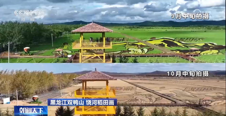 現(xiàn)在看到的綠色的稻田畫是9月中旬記者在黑龍江省雙鴨山市饒河縣拍攝的,黃色的稻田畫是10中旬同一地方拍攝。豐收前的稻田綠意盎然,稻葉挺拔、稻花清香、充滿生機(jī);即將迎來豐收的稻田稻穗垂掛,陽光下金光閃閃,田野如金色海洋般燦爛,美不勝收。