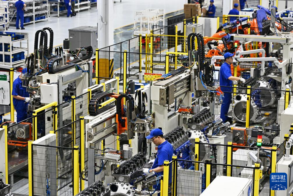 在濰柴集團(tuán)車間內(nèi),工人在裝配發(fā)動(dòng)機(jī)(8月21日攝)。新華社記者 李紫恒 攝