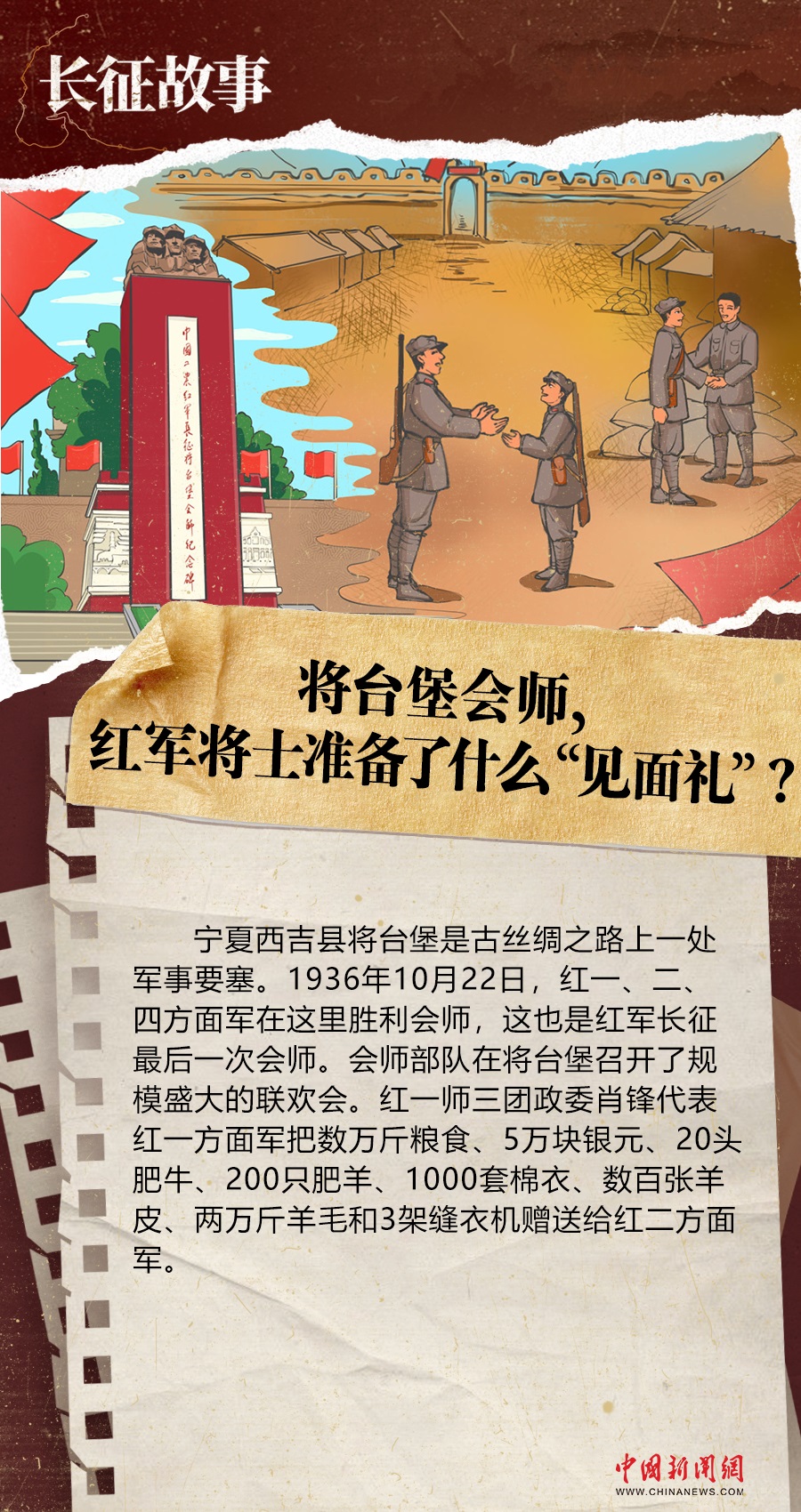 寧夏西吉縣將臺(tái)堡是古絲綢之路上一處軍事要塞。1936年10月22日,紅一、二、四方面軍在這里勝利會(huì)師,這也是紅軍長征最后一次會(huì)師。會(huì)師部隊(duì)在將臺(tái)堡召開了規(guī)模盛大的聯(lián)歡會(huì)。紅一師三團(tuán)政委肖鋒代表紅一方面軍把數(shù)萬斤糧食、5萬塊銀元、20頭肥牛、200只肥羊、1000套棉衣、數(shù)百張羊皮、兩萬斤羊毛和3架縫衣機(jī)贈(zèng)送給紅二方面軍。