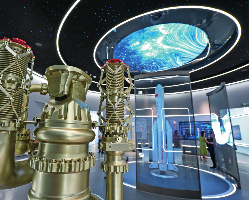 在無錫商業(yè)航天展示館拍攝的火箭發(fā)動(dòng)機(jī)模型(2024 年 9 月 9 日攝) 楊磊攝 / 本刊