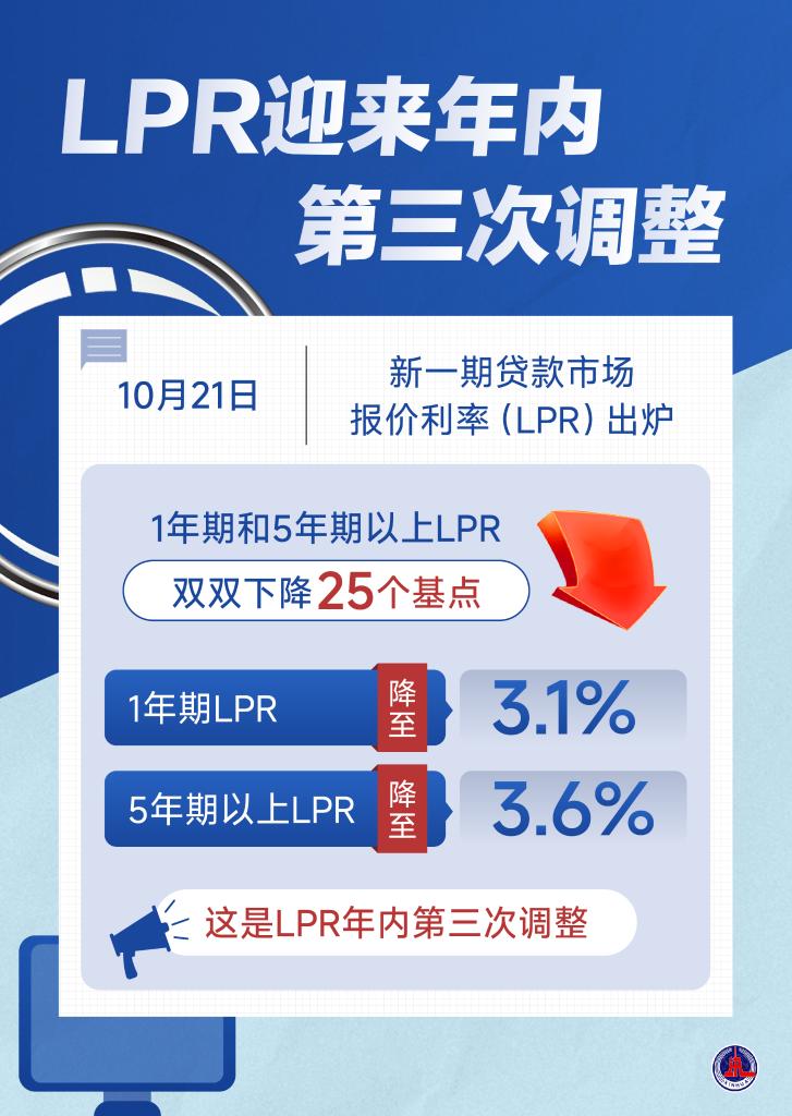 10月21日,新一期貸款市場報價利率(LPR)發(fā)布,1年期和5年期以上LPR雙雙下降25個基點,1年期LPR降至3.1%,5年期以上LPR降至3.6%。