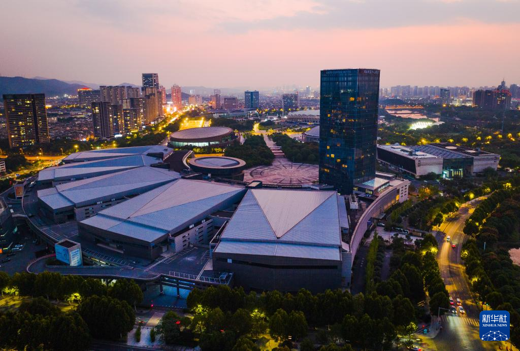 鳥瞰暮色下的義烏(無人機(jī)照片,10月9日攝)。新華社記者 翁忻旸 攝