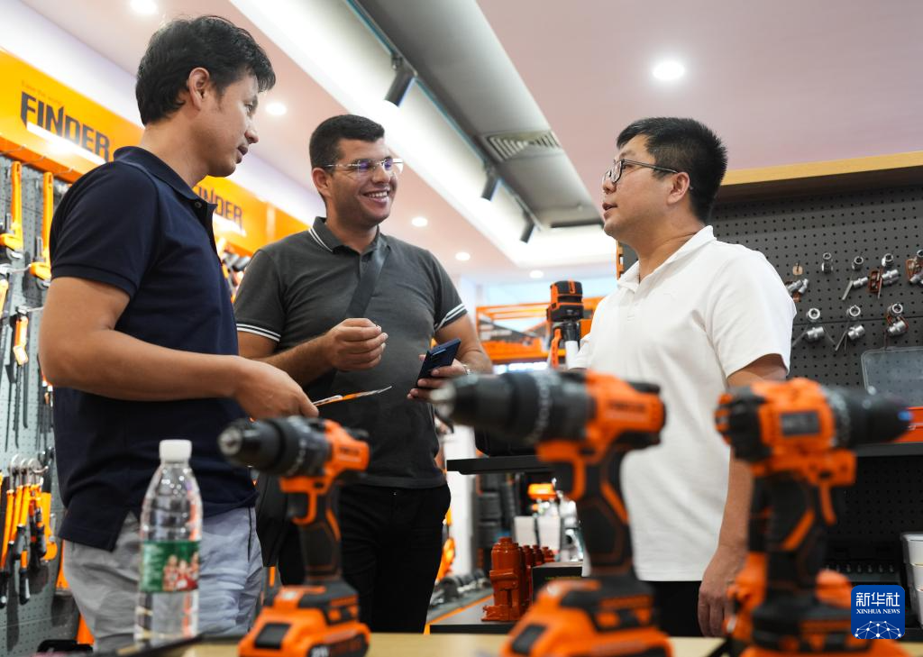 義烏發(fā)現(xiàn)者進(jìn)出口有限公司銷售部經(jīng)理艾彬(右)向來自突尼斯的客戶介紹鉆頭(10月9日攝)。新華社記者 翁忻旸 攝
