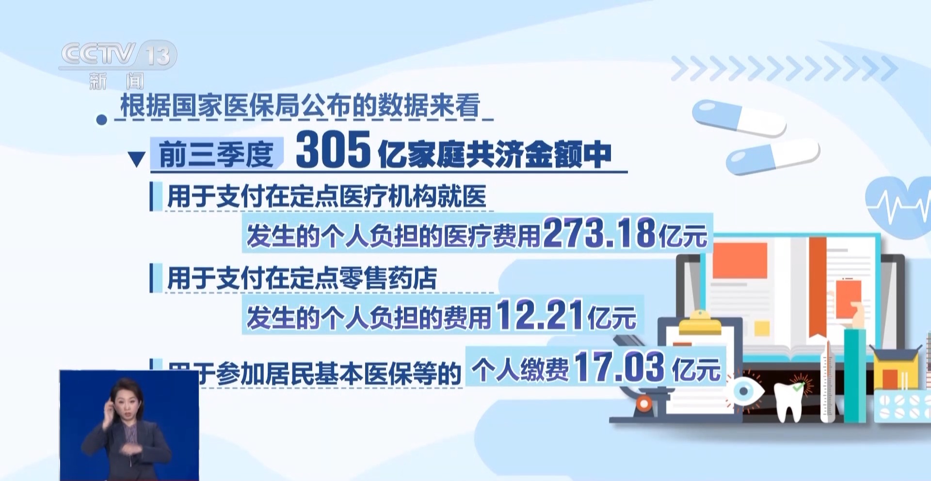 根據(jù)國家醫(yī)保局公布的數(shù)據(jù)來看,前三季度的305億家庭共濟(jì)金額中,用于支付在定點醫(yī)療機(jī)構(gòu)就醫(yī)發(fā)生的個人負(fù)擔(dān)的醫(yī)療費用273.18億元,用于支付在定點零售藥店發(fā)生的個人負(fù)擔(dān)的費用12.21億元,用于參加居民基本醫(yī)保等的個人繳費17.03億元。