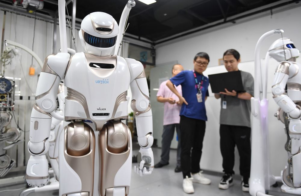 2024年6月26日,在位于深圳市南山區(qū)智園的優(yōu)必選總部,工作人員對人形機(jī)器人進(jìn)行測試。新華社記者毛思倩攝