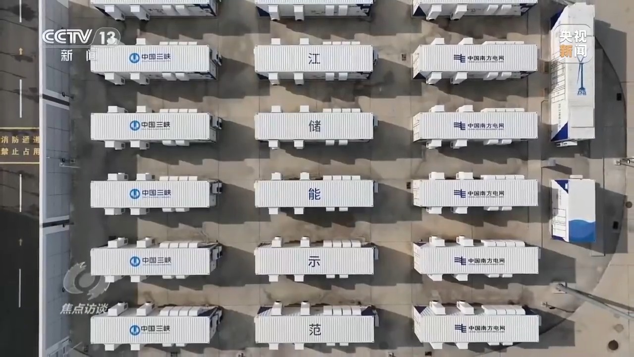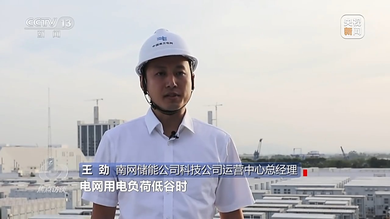 南網(wǎng)儲能公司科技公司運(yùn)營中心總經(jīng)理 王勁:電網(wǎng)用電負(fù)荷低谷時,把電廠發(fā)出的多余的電儲存到250個電池儲能柜內(nèi),用電高峰時,把電池儲能柜里的電能釋放出來支持電網(wǎng)的電力供應(yīng)。