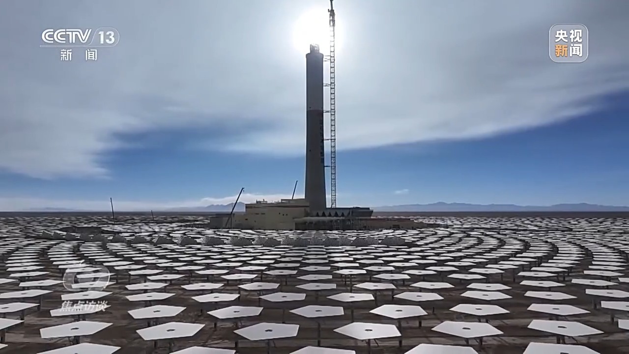 電站通過高精度智能定日鏡,實(shí)時跟蹤太陽的運(yùn)動,將太陽直接輻射光反射聚集到吸熱塔上,將吸熱塔內(nèi)的熔鹽加熱到560多℃的高溫,將高溫的熔鹽進(jìn)行儲存,在需要發(fā)電時再通過高溫熔鹽與水進(jìn)行熱交換,產(chǎn)生高溫高壓的蒸汽,驅(qū)動汽輪發(fā)電機(jī)組發(fā)電。