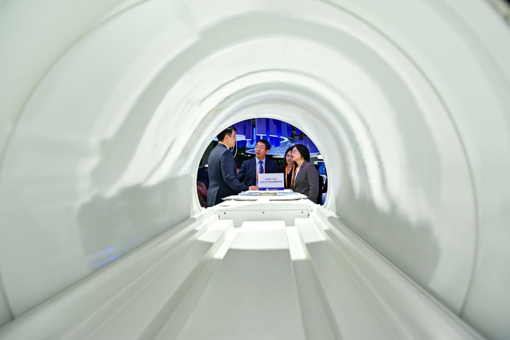 11月5日,人們在第七屆進博會醫(yī)療器械及醫(yī)藥保健展區(qū)GE醫(yī)療展臺了解一款讀秒成像磁共振儀器。新華社記者 張鋮 攝