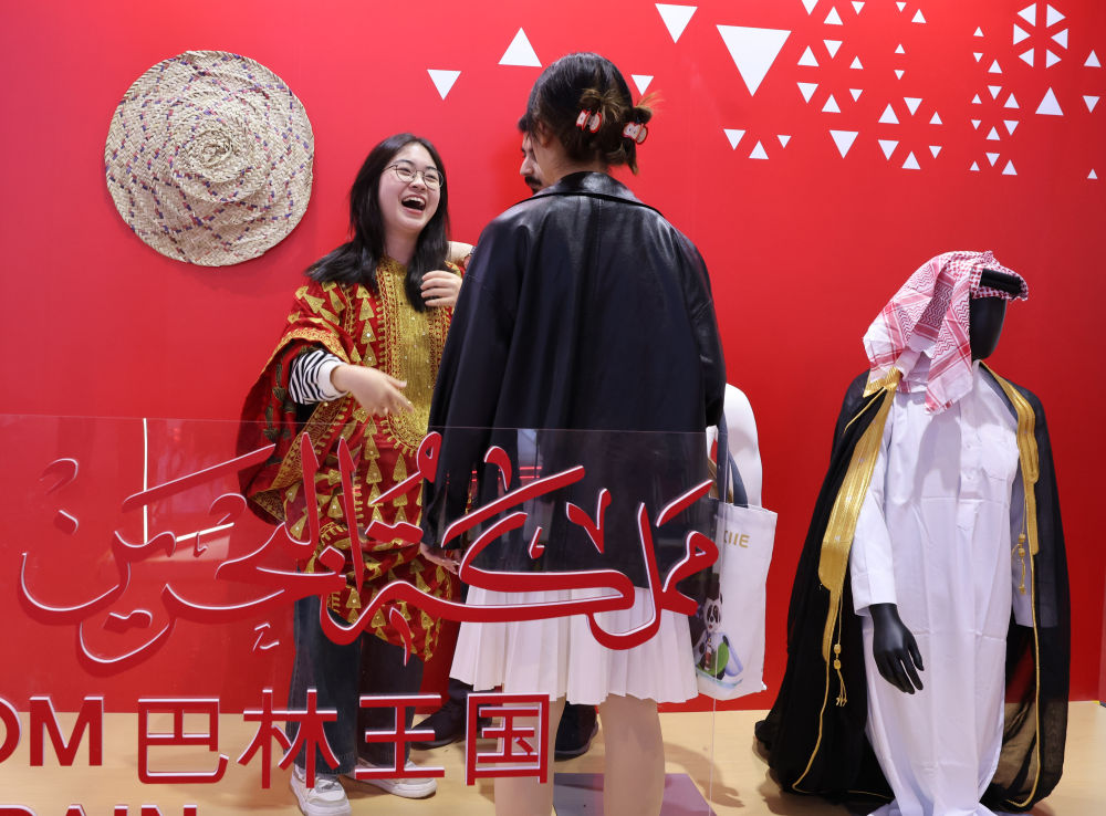 11月5日,參會者在第七屆進博會國家展巴林館試穿巴林服裝。新華社記者 殷剛 攝