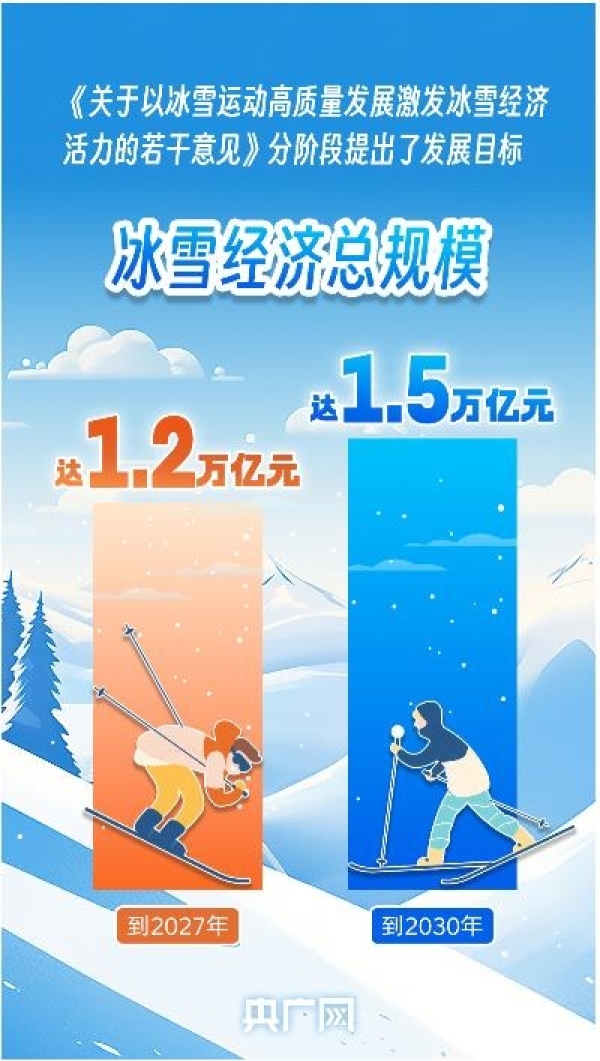 近日,國務院辦公廳公開發(fā)布《關(guān)于以冰雪運動高質(zhì)量發(fā)展激發(fā)冰雪經(jīng)濟活力的若干意見》(以下簡稱《意見》),分階段提出發(fā)展目標:到2027年,冰雪運動場地設(shè)施更加完善,服務水平顯著提升,冰雪運動更加廣泛開展,冰雪經(jīng)濟總規(guī)模達1.2萬億元。到2030年,冰雪經(jīng)濟主要產(chǎn)業(yè)鏈條實現(xiàn)高水平協(xié)調(diào)融合發(fā)展,冰雪消費成為擴大內(nèi)需的重要增長點,冰雪經(jīng)濟總規(guī)模達1.5萬億元。