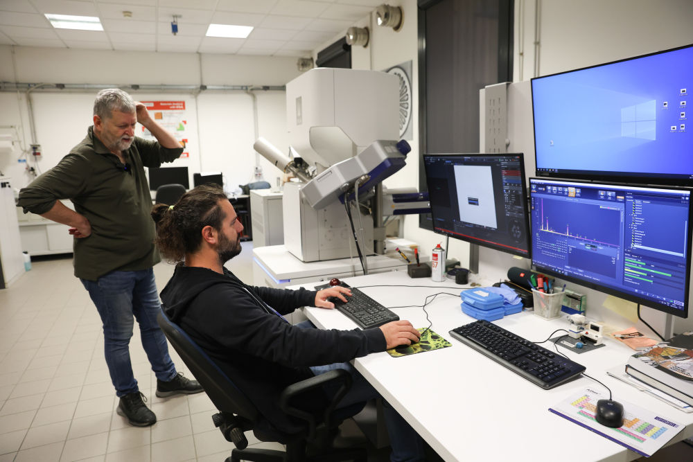 11月6日,意大利帕多瓦大學文化遺產學院教授馬西莫·維達萊(左)與研究人員在實驗室討論青銅獅樣本檢測分析過程。新華社記者李京攝