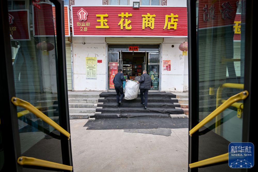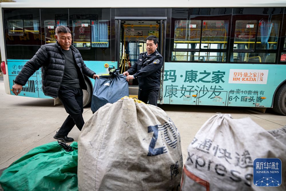 11月10日,隆德縣公交車司機(左)和聯(lián)財鎮(zhèn)聯(lián)合村快遞點經(jīng)營者將快遞卸下公交車。
