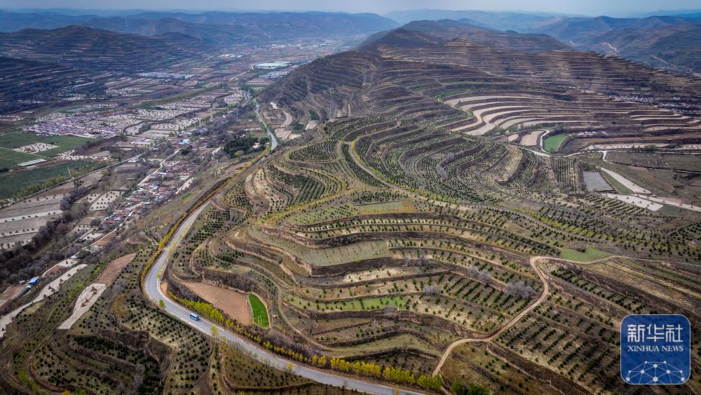 11月9日,一輛載有乘客和快遞物品的公交車從隆德縣城駛出(無人機照片)。