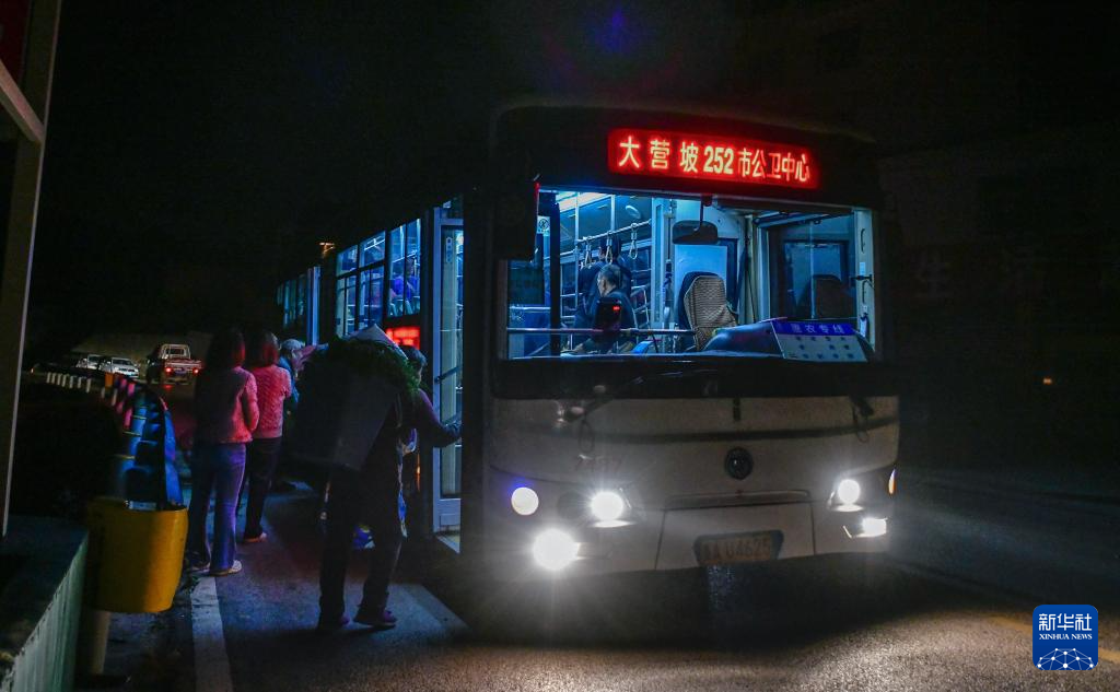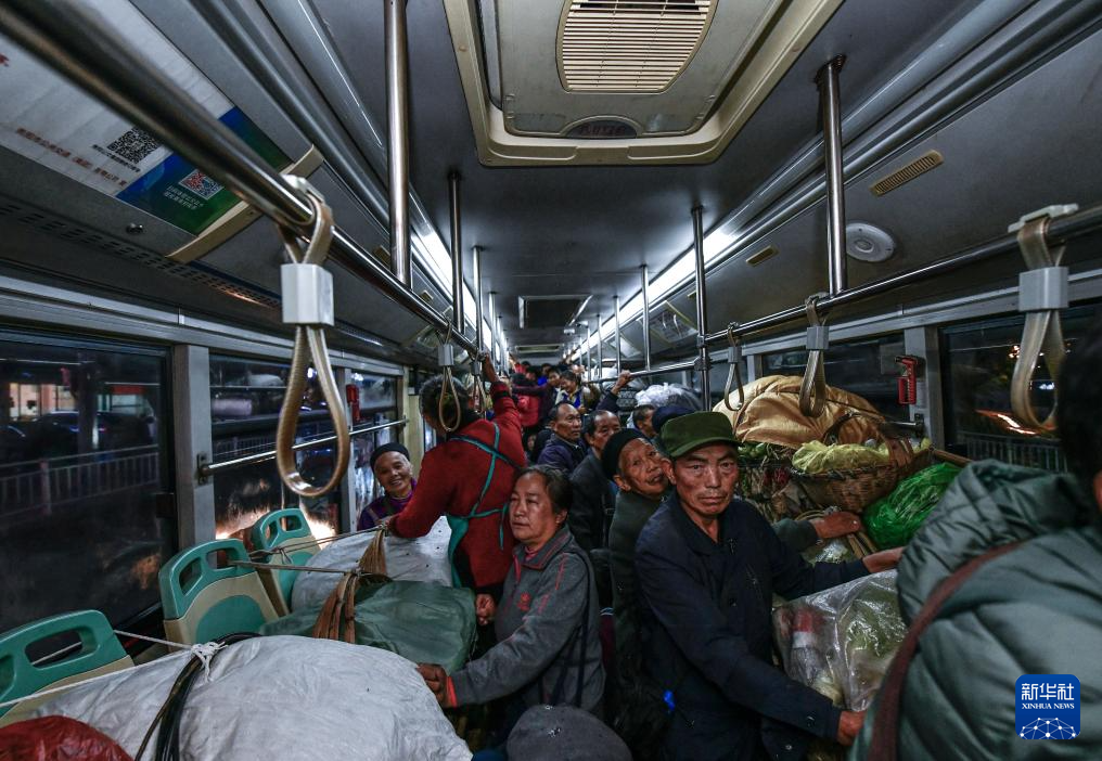 在貴陽市烏當區(qū)水田鎮(zhèn)定扒村,菜農(nóng)乘坐252路“惠農(nóng)專線”公交車,準備進城賣菜(11月7日攝)。