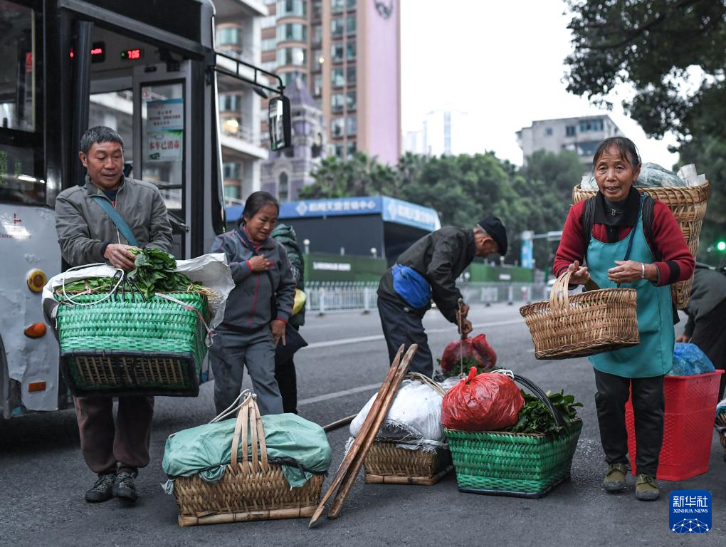 菜農(nóng)乘坐252路“惠農(nóng)專線”公交車抵達貴陽市大營坡終點站,準備將蔬菜就近售賣(11月7日攝)。