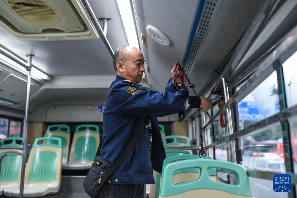 司機張桂林在252路“惠農(nóng)專線”公交車抵達貴陽市大營坡終點站后整理置物架(11月7日攝)。