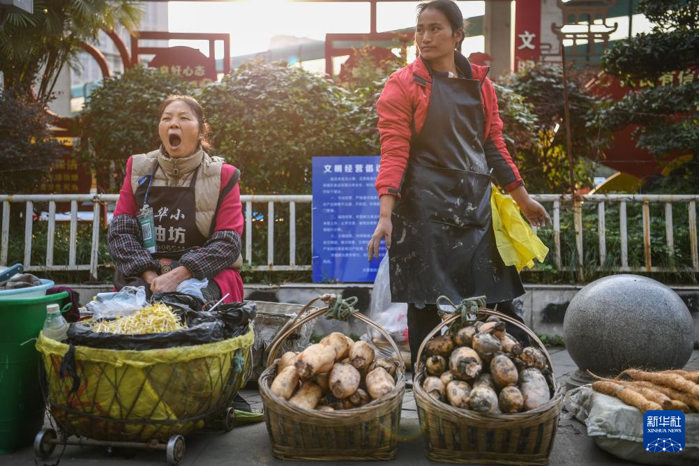 乘坐252路“惠農(nóng)專線”公交車進城的菜農(nóng)在貴陽市大營坡附近賣菜(11月7日攝)。