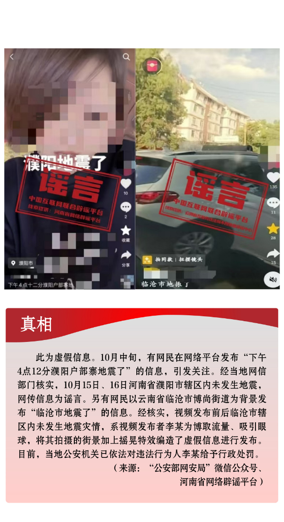 危言聳聽炒作話題。個別網(wǎng)民和自媒體編造虛假信息,炒作社會熱點話題,并配以具有煽動性、誤導性的標題,擴散傳播,擾亂社會秩序。10月中旬,新疆喀什、阿克蘇地區(qū)相繼發(fā)生地震,部分自媒體罔顧事實,利用AI技術(shù)拼湊網(wǎng)絡(luò)舊圖,編造完全與事實不符的地震廢墟或災(zāi)后救援圖片,混淆視聽,嚴重誤導網(wǎng)民。另有個別網(wǎng)民將拍攝的街景加上搖晃特效,惡意杜撰云南發(fā)生地震,引發(fā)公眾恐慌,造成不良影響。還有網(wǎng)民為給網(wǎng)店營銷引流,利用家長們高度關(guān)注兒童安全話題的心理,無中生有編造“四川巴中頻繁有青少年失蹤”謠言,引發(fā)公眾焦慮恐慌。