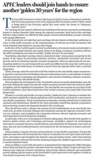原標(biāo)題:APEC leaders should join hands to ensure another 'golden 30 years' for the region