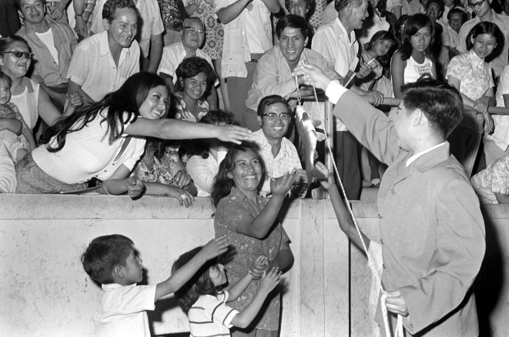 1973年2月,沈陽(yáng)雜技團(tuán)赴秘魯進(jìn)行友好訪問(wèn)演出。這是演員劉忠表演魔術(shù)《釣魚(yú)》,受到秘魯觀眾的熱烈歡迎。