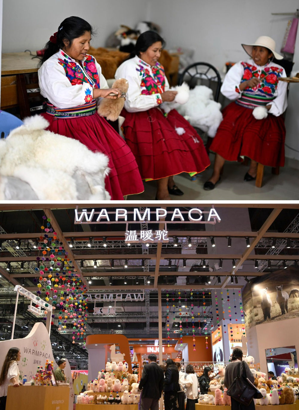 2016年,中國(guó)姑娘馬玉霞在秘魯阿雷基帕街邊市場(chǎng)購(gòu)買(mǎi)了秘魯羊駝毛制品手工藝人奧斯瓦爾多·馬馬尼的羊駝毛玩偶并引入中國(guó)市場(chǎng)。通過(guò)連續(xù)參展進(jìn)博會(huì),羊駝毛制品在中國(guó)市場(chǎng)大受歡迎,并創(chuàng)立了中文品牌“溫暖駝”。今年,秘魯品牌“溫暖駝”連續(xù)第七年亮相進(jìn)博會(huì),受到更多中國(guó)消費(fèi)者的喜愛(ài)。目前,“溫暖駝”品牌已入駐國(guó)內(nèi)30多家商場(chǎng),并且開(kāi)拓了電商平臺(tái)線上銷售,年銷量超過(guò)3萬(wàn)只。上圖:2024年6月20日,在秘魯阿雷基帕,工作人員在羊駝毛制品手工藝人奧斯瓦爾多·馬馬尼的工坊制作羊駝玩偶。下圖:2024年11月5日在上海拍攝的第七屆進(jìn)博會(huì)秘魯“溫暖駝”展臺(tái)。
