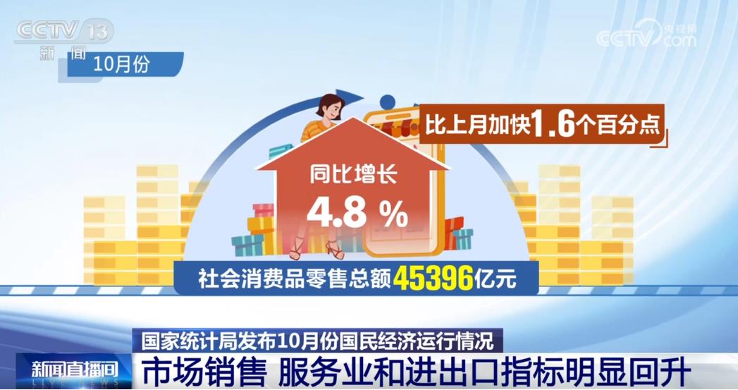 先說“三個(gè)回升”,10月份,市場(chǎng)銷售、服務(wù)業(yè)和進(jìn)出口三個(gè)指標(biāo)明顯回升。從市場(chǎng)銷售看,受消費(fèi)品以舊換新政策帶動(dòng),10月份社會(huì)消費(fèi)品零售總額同比增長(zhǎng)4.8%,增速比上月加快1.6個(gè)百分點(diǎn),其中服務(wù)零售增勢(shì)依然較好。