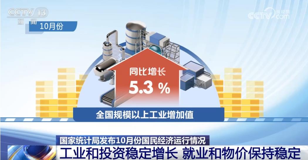 再說“兩個(gè)穩(wěn)定”,一是工業(yè)和投資穩(wěn)定增長(zhǎng),二是指就業(yè)和物價(jià)保持穩(wěn)定。從工業(yè)來看,在大規(guī)模的設(shè)備更新以及產(chǎn)業(yè)升級(jí)發(fā)展等因素驅(qū)動(dòng)下,10月份規(guī)模以上工業(yè)增加值同比增長(zhǎng)5.3%,繼續(xù)保持較快增長(zhǎng),其中制造業(yè)升級(jí)發(fā)展態(tài)勢(shì)明顯。