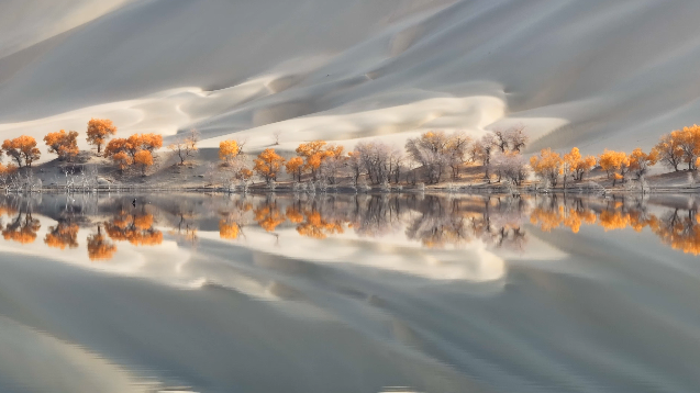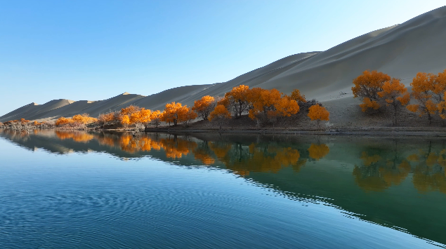 近日,新疆尉犁縣羅布湖風(fēng)景游覽區(qū)。羅布湖宛如一面明鏡,映照出周圍景色的倒影,綿延的沙丘、金色的胡楊、碧藍(lán)的天空,與湖面的鏡像世界構(gòu)成一幅絕美的自然畫卷。