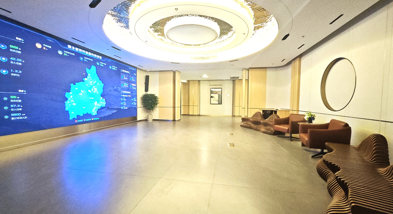 進入中心,映入眼簾的是占據(jù)整面墻的智能大屏,中心內所有公共區(qū)域的實時場景一覽無余。