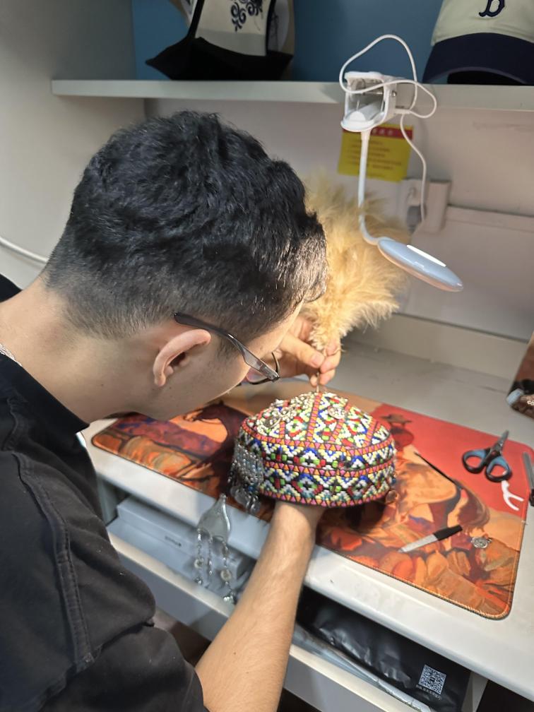 在“哈薩克非遺工坊”,唐寶手拿針線對(duì)一頂哈薩克族花帽進(jìn)行設(shè)計(jì)。受訪者供圖