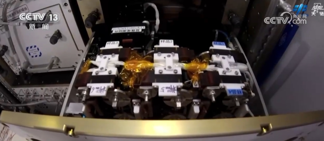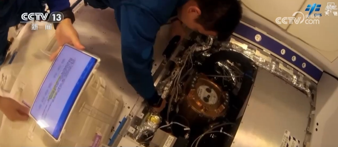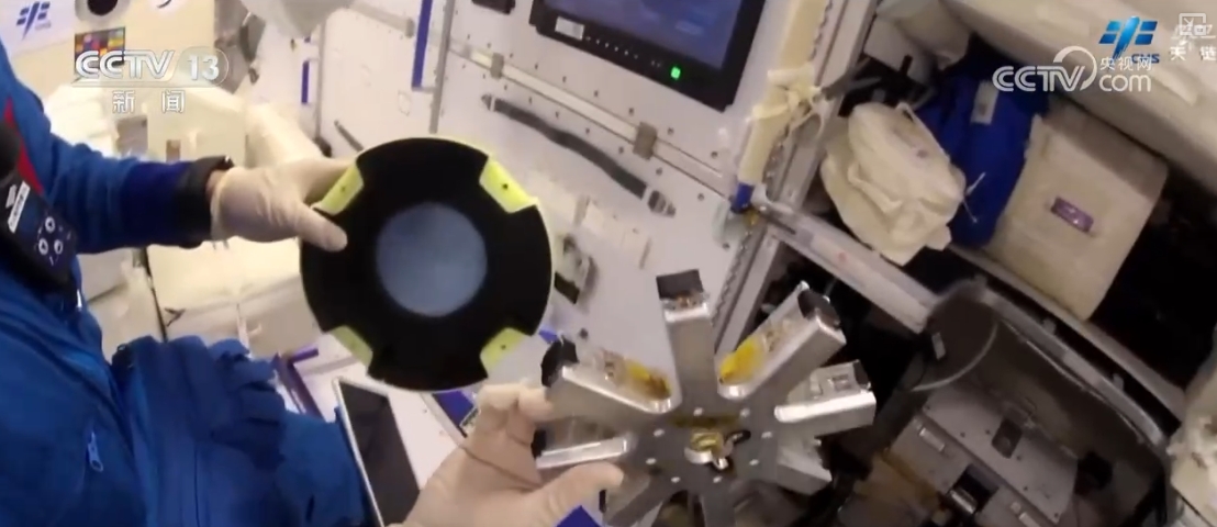 乘組還完成了流體物理實(shí)驗(yàn)柜固液介觀實(shí)驗(yàn)單元樣品盤(pán)檢查、實(shí)驗(yàn)樣品更換,無(wú)容器柜實(shí)驗(yàn)腔體樣品清理、實(shí)驗(yàn)樣品更換、軸心機(jī)構(gòu)電極維護(hù)等多項(xiàng)操作。