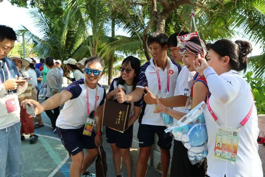 在運(yùn)動(dòng)會(huì)毽球場(chǎng)館,每支參賽隊(duì)伍都收到了香港代表團(tuán)贈(zèng)送的毽球掛飾或龍形胸針。西藏代表團(tuán)的壯族小伙韋盛森計(jì)劃回贈(zèng)具有壯族特色的“繡球”;而早就與香港運(yùn)動(dòng)員因毽球結(jié)緣的廣東隊(duì)老將孫麗艷則決定——等香港隊(duì)在圣誕節(jié)到廣東集訓(xùn)時(shí),她要給老朋友回贈(zèng)實(shí)用的禮物。