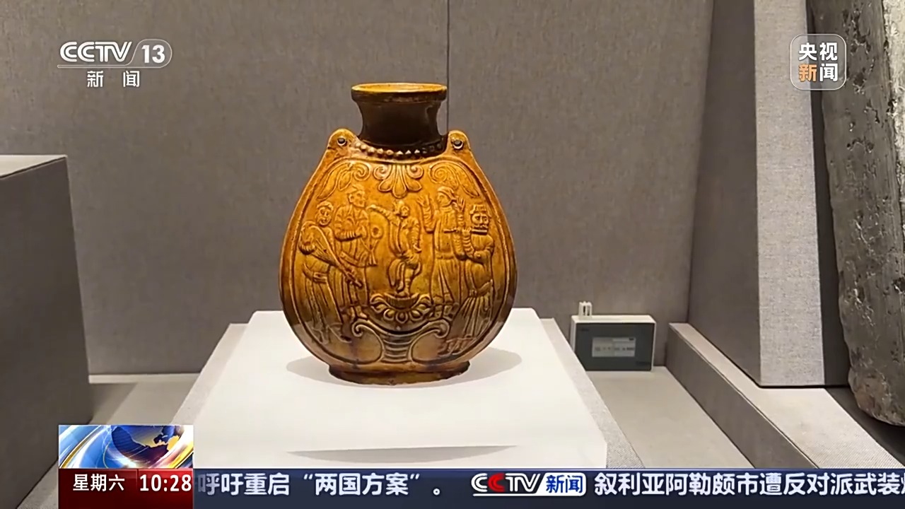 2000多年前,張騫出使西域,絲綢之路得以正式貫通。到了南北朝時期,陶瓷、鐵器等商品,就通過絲綢之路被大量運往西域,胡樂、胡舞也通過絲綢之路進(jìn)入中原。河南博物院收藏的一件黃釉扁壺,留下了這段時期東西方文化交流的歷史痕跡。