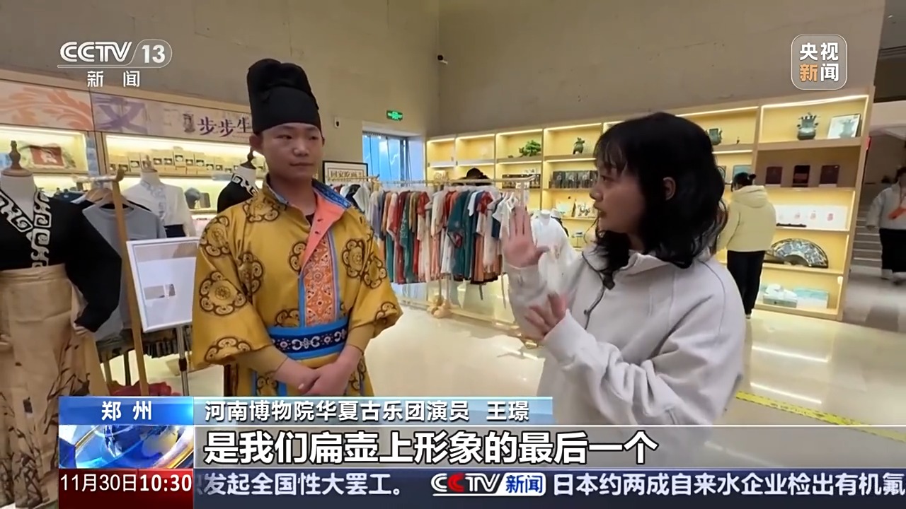 河南博物院華夏古樂團(tuán)演員 王璟:我們也是依據(jù)一些文獻(xiàn)記載,比如說我們有一個動作是提臀動胯,是當(dāng)時的一個胡人的舞蹈形象。還有揚眉動目是我們扁壺上形象的最后一個。