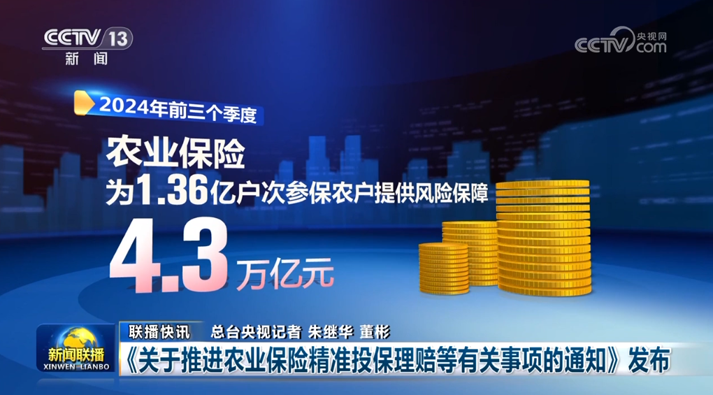 金融監(jiān)管總局等四部門近日聯(lián)合發(fā)布通知,對農(nóng)業(yè)保險投保理賠、應(yīng)收保費、條款費率、數(shù)據(jù)共享等提出要求,進一步提高投保理賠精準性,推動我國農(nóng)業(yè)保險高質(zhì)量發(fā)展。今年前三個季度,農(nóng)業(yè)保險為1.36億戶次參保農(nóng)戶提供風險保障4.3萬億元。