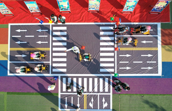 12月1日,在山東省臨沂市沂南縣雙堠鎮(zhèn)中心幼兒園,孩子們通過趣味游戲的方式學(xué)習(xí)交通知識(無人機照片)。新華社發(fā)(王彥冰攝)
