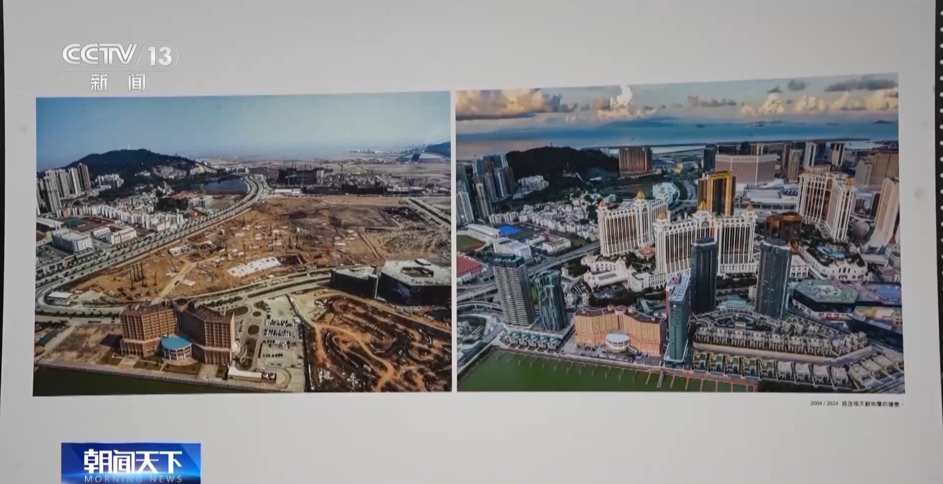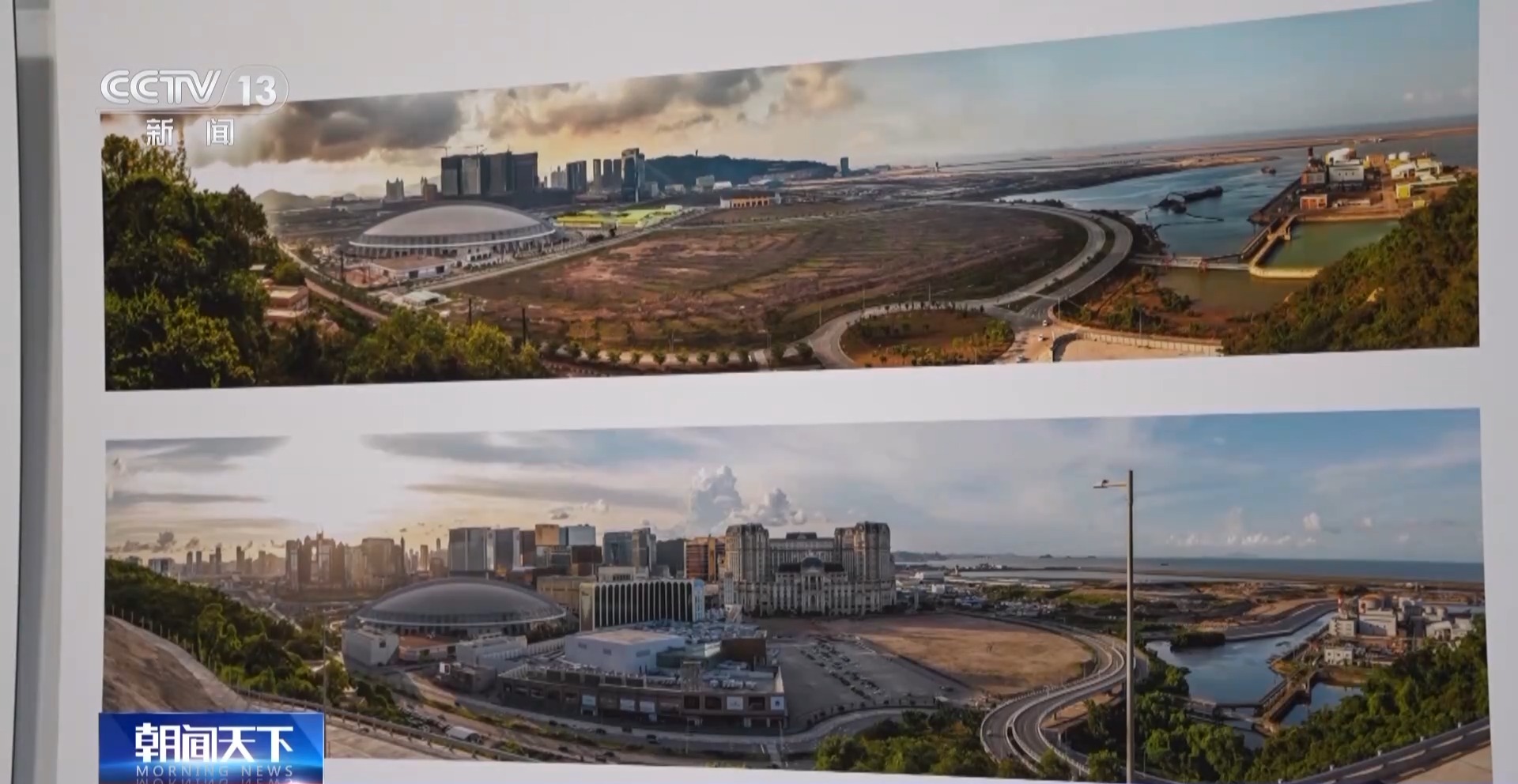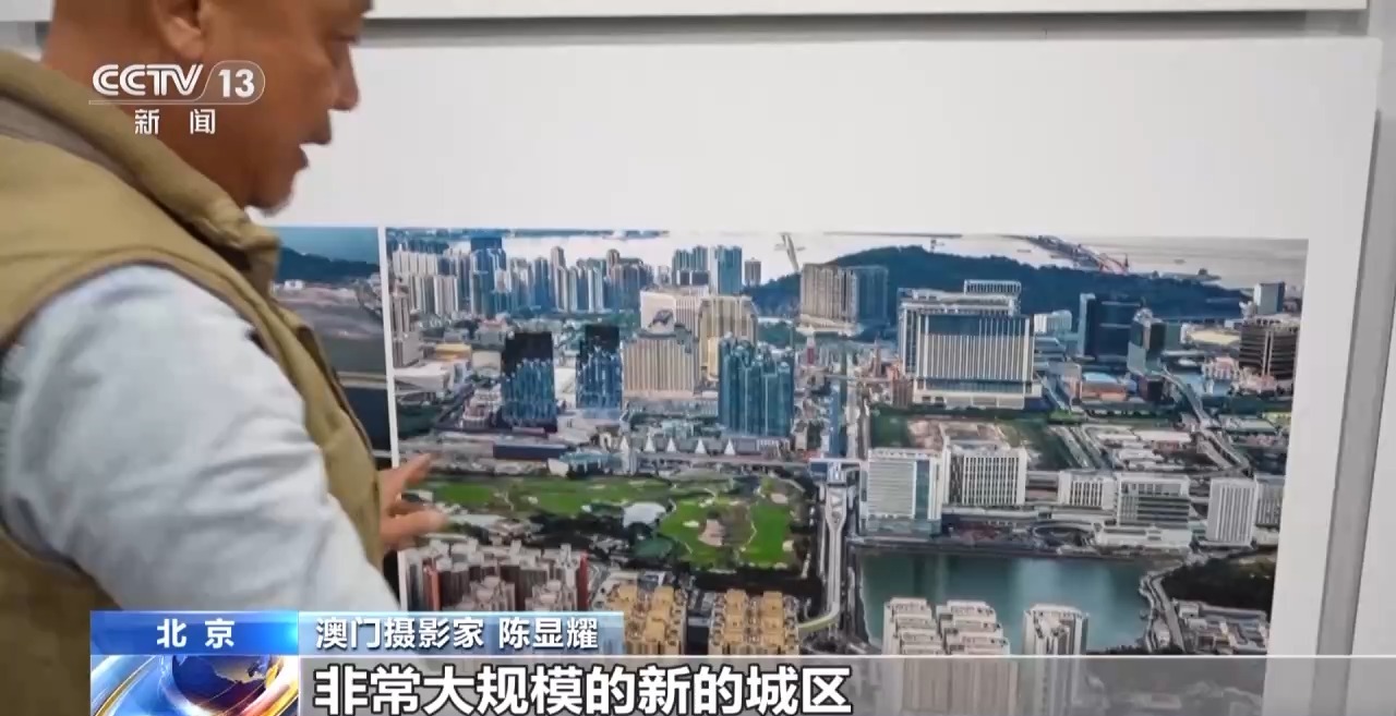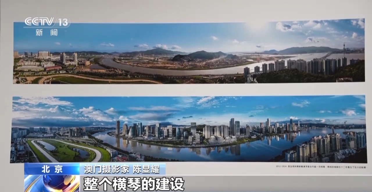 澳門攝影家 陳顯耀:回歸之后,隨著我們澳門的發(fā)展,也是帶動周邊區(qū)域一起發(fā)展繁榮。我們畫面看到的是橫琴,上面的照片是2012年的時候,橫琴都是山體,在準(zhǔn)備開發(fā)了。下面是成立的橫琴粵澳深度合作區(qū),整個橫琴的建設(shè)也為我們澳門的發(fā)展建設(shè)提供了一個很重要的支撐、保障。