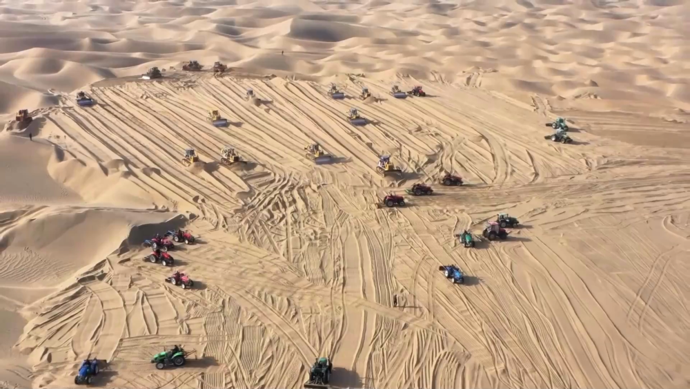 在發(fā)展沙產(chǎn)業(yè)的過(guò)程中,新疆和田地區(qū)民豐縣多措并舉深入推進(jìn)“三北”工程攻堅(jiān)戰(zhàn)、扎實(shí)推進(jìn)塔克拉瑪干沙漠邊緣阻擊戰(zhàn)。12月5日,民豐縣后河壩沙漠邊緣,大型推土機(jī)來(lái)回穿梭、平整沙地。一大早,尼雅鎮(zhèn)甫甫克村村民麥麥提·麥提賽伊迪與愛(ài)人就來(lái)到自己承包的沙地,查看沙丘的平整情況。