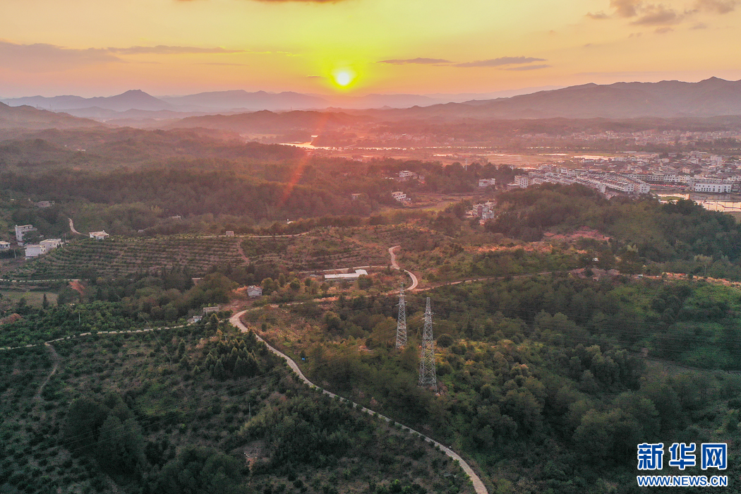 這是在長汀縣三洲鎮(zhèn)豐盈美麗生態(tài)農(nóng)場拍攝到的落日景觀。如今,這里月月有花開,季季有果采,昔日“火焰山”變成了“花果山”(無人機照片)。新華網(wǎng) 肖和勇 攝