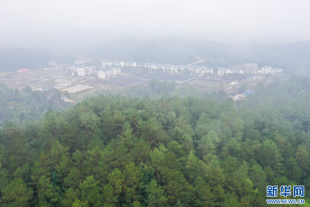 這是在長汀縣水土保持科教園附近拍攝到的鄉(xiāng)村冬日景觀。晨霧中,綠色森林環(huán)抱美麗鄉(xiāng)村(無人機照片)。新華網(wǎng) 肖和勇 攝
