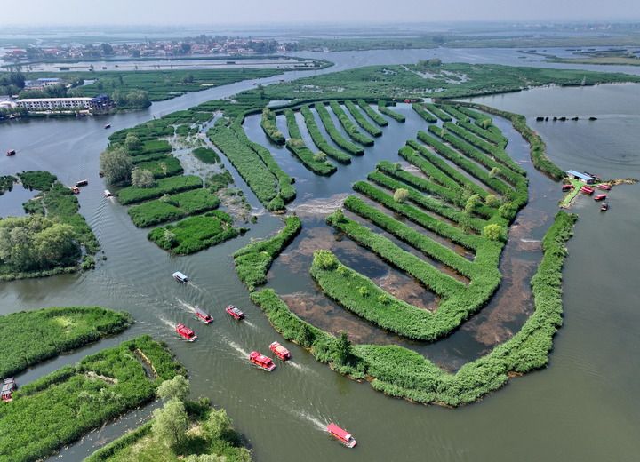 游船在河北雄安新區(qū)白洋淀內(nèi)游覽(2024年5月8日攝,無人機照片)。