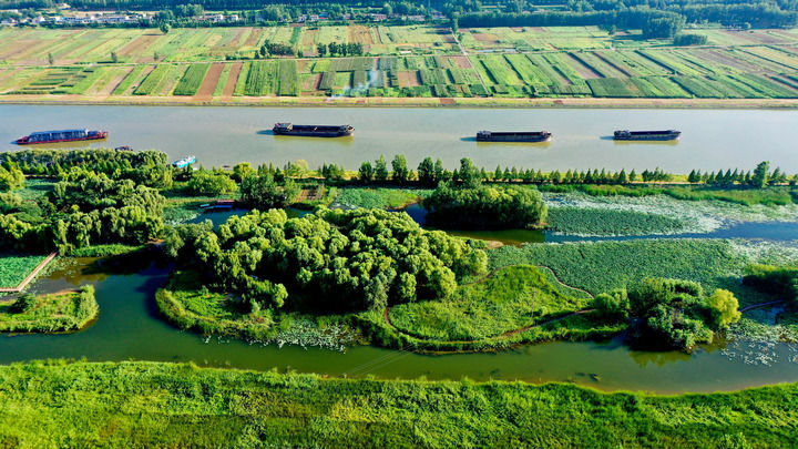 這是在山東省棗莊市臺兒莊區(qū)拍攝的大運河國家文化公園(棗莊段)兩岸景色(2023年8月9日攝,無人機照片)。
