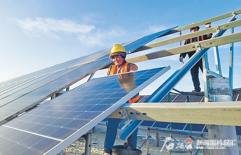 12月1日,位于和田市吉亞鄉(xiāng)的華潤新能源50萬千瓦光伏治沙項目施工現(xiàn)場一派熱火朝天景象。該項目總投資約15億元,預(yù)計明年5月底實現(xiàn)全容量投產(chǎn)。圖為工人在鋪設(shè)光伏板。 石榴云/新疆日報記者 湯永攝