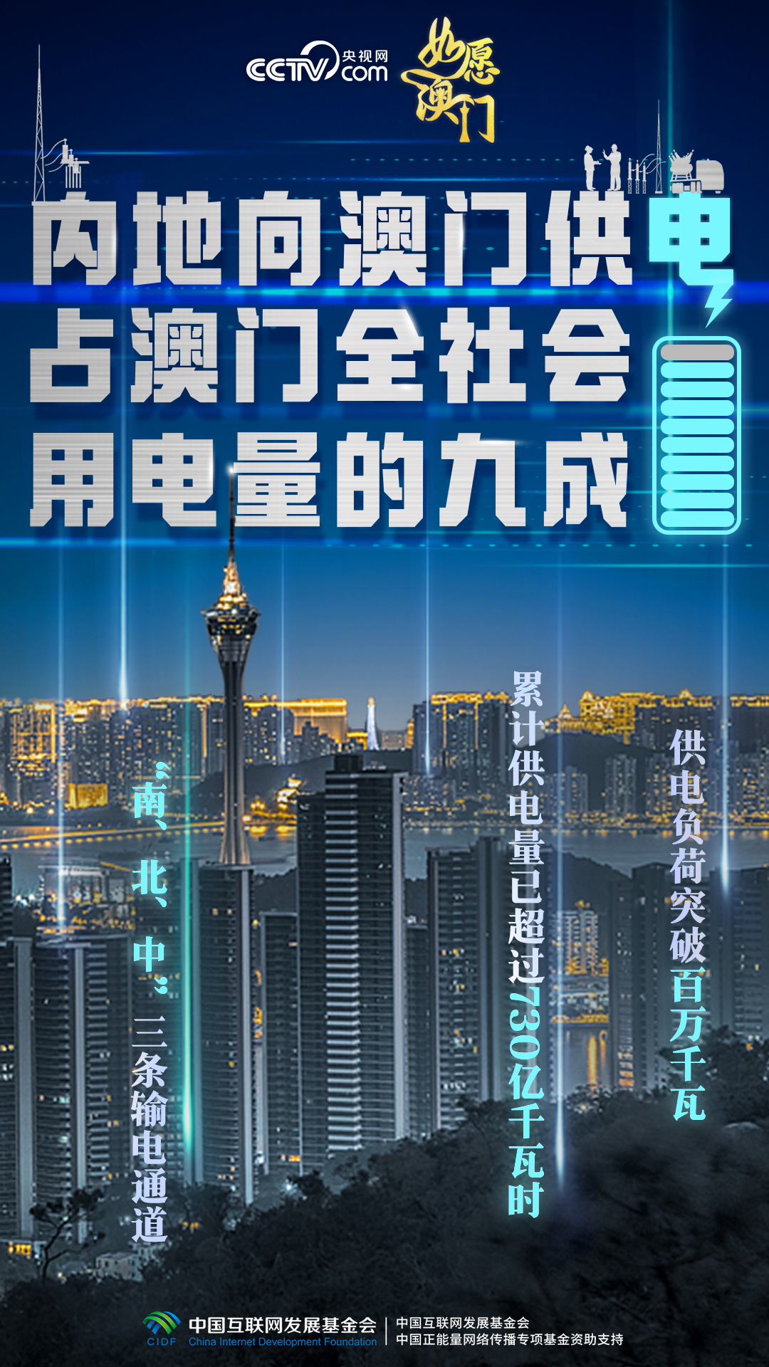 澳門缺電,南海油氣田里伸出專供澳門發(fā)電的天然氣管道,粵澳“南、北、中”三條輸電通道接續(xù)架設,條條“銀線”相連,為澳門經(jīng)濟社會發(fā)展注入源源不斷的強勁動能。1999年回歸當年,內地對澳供電量為1.95億千瓦時;2024年7月,內地向澳門供電負荷突破百萬千瓦,累計供電量已超過730億千瓦時。