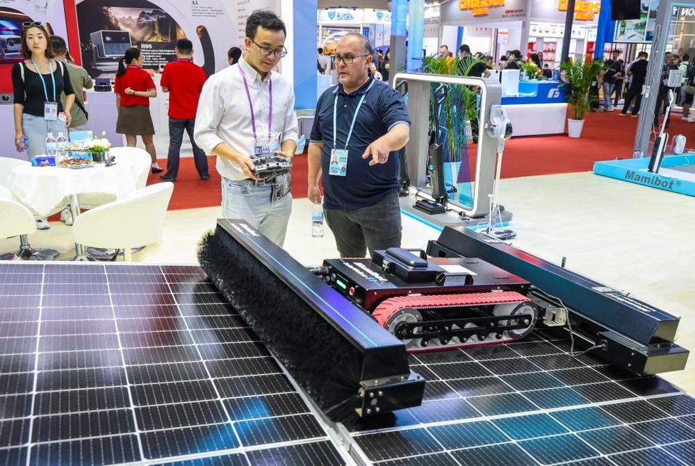 10月15日,采購商在第136屆廣交會展館了解一款太陽能面板自動清潔機器人產品。(新華社記者 劉大偉 攝)