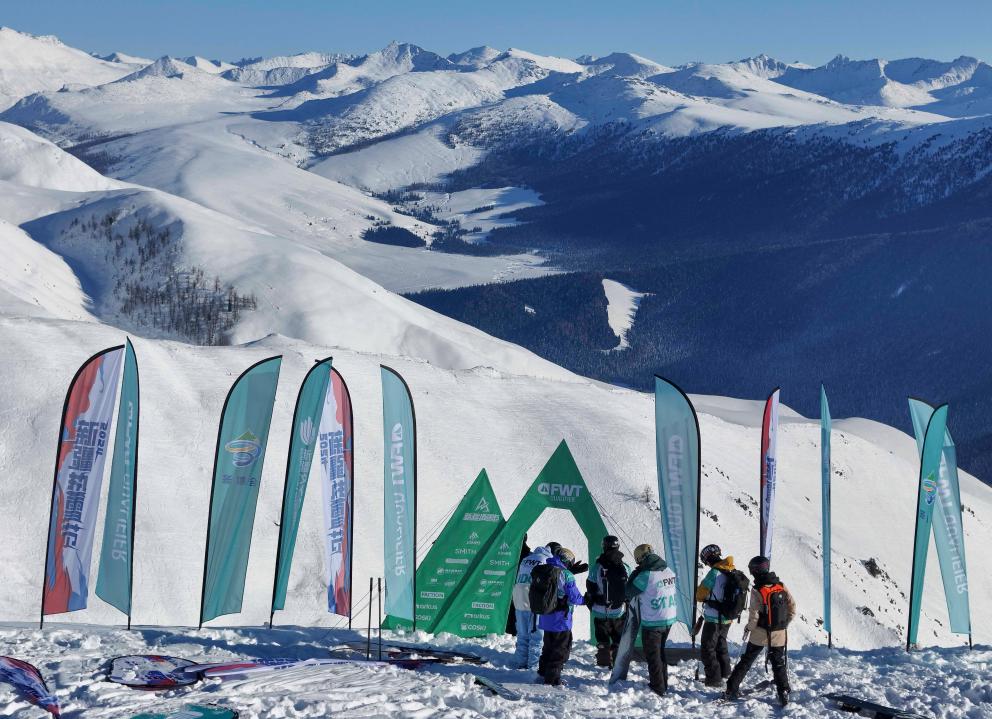 12月4日,世界野雪巡回賽新疆禾木站工作人員在禾木吉克普林國(guó)際滑雪度假區(qū)勘查比賽場(chǎng)地(無(wú)人機(jī)照片)。新華社記者 胡虎虎 攝