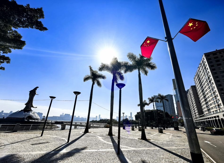 12月18日,澳門街頭隨處可見慶祝澳門回歸祖國(guó)25周年的元素,國(guó)旗及特區(qū)區(qū)旗隨風(fēng)飄揚(yáng)。(海外網(wǎng) 牛寧 攝)