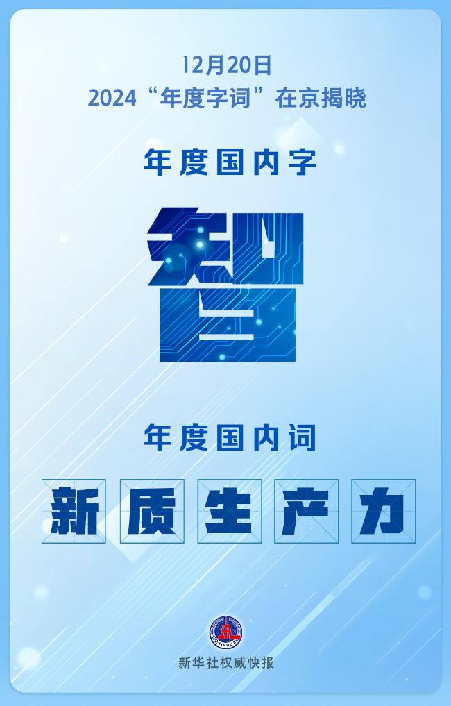 12月20日,“漢語盤點(diǎn)2024”活動(dòng)在京揭曉“年度字詞”——“智”“新質(zhì)生產(chǎn)力”“變”“人工智能”分別當(dāng)選2024年度國內(nèi)字、國內(nèi)詞、國際字、國際詞。