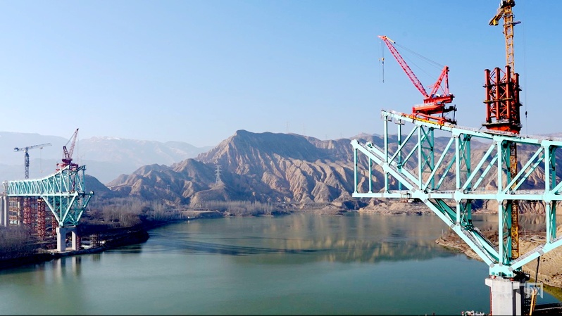 圖為12月20日拍攝的尖扎黃河特大橋施工現(xiàn)場(央廣網(wǎng)記者 汪曉青 攝)