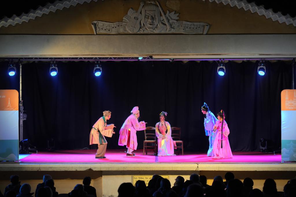 12月17日,在法國佩爾訥萊方丹,來自中國福建展演團(tuán)的演員以高甲戲的形式演繹法國喜劇作家莫里哀代表作《吝嗇鬼》。(新華社記者 孫鑫晶攝)